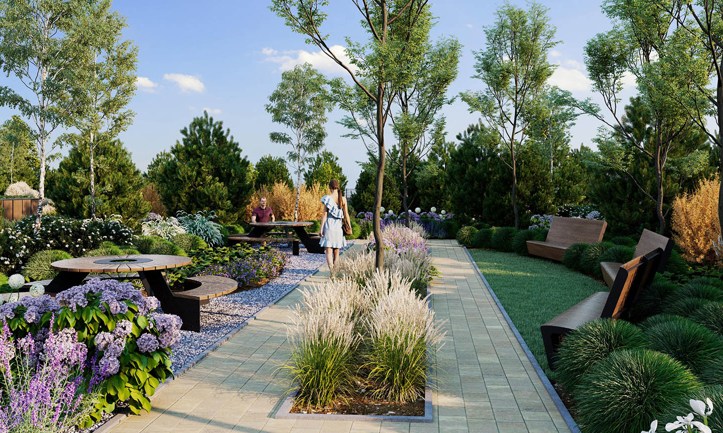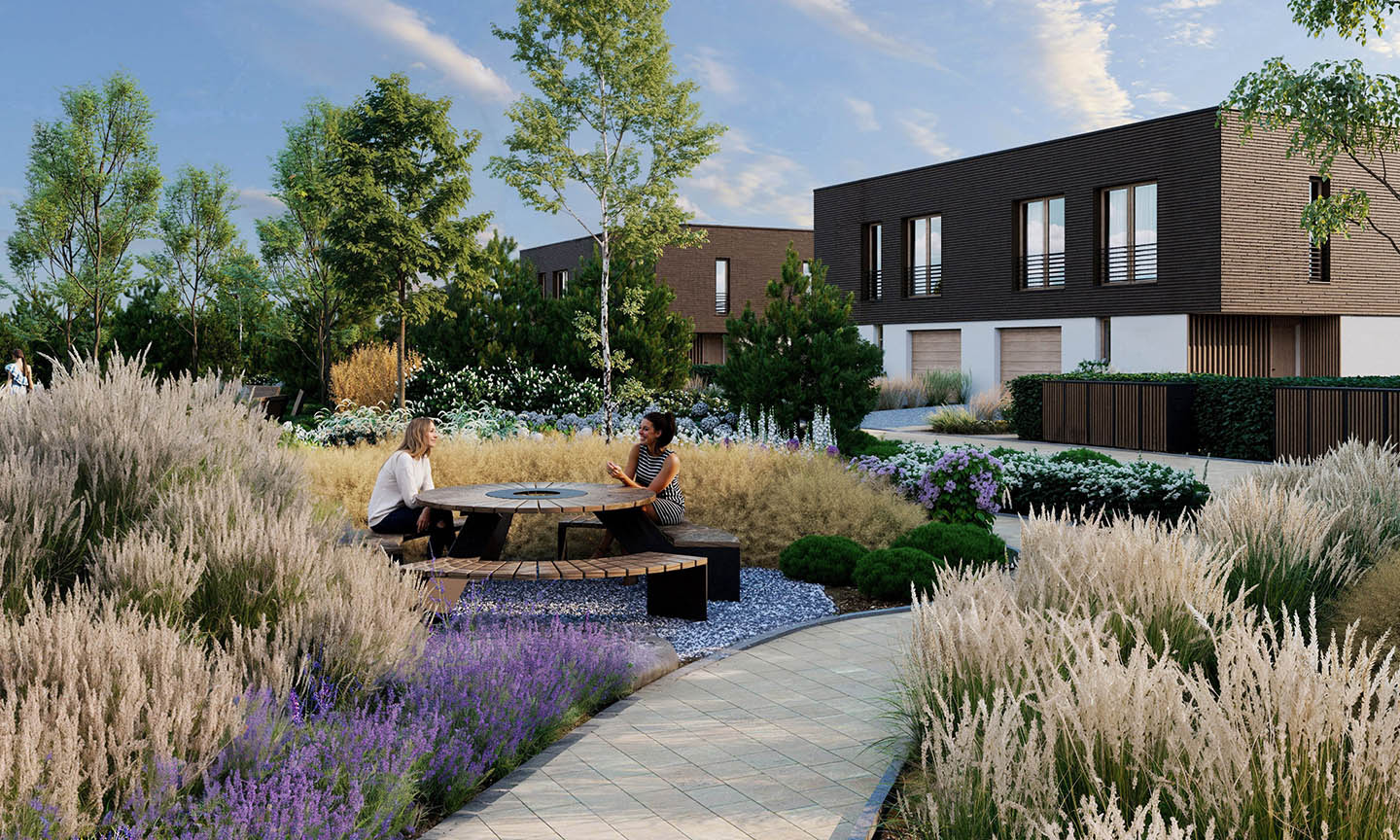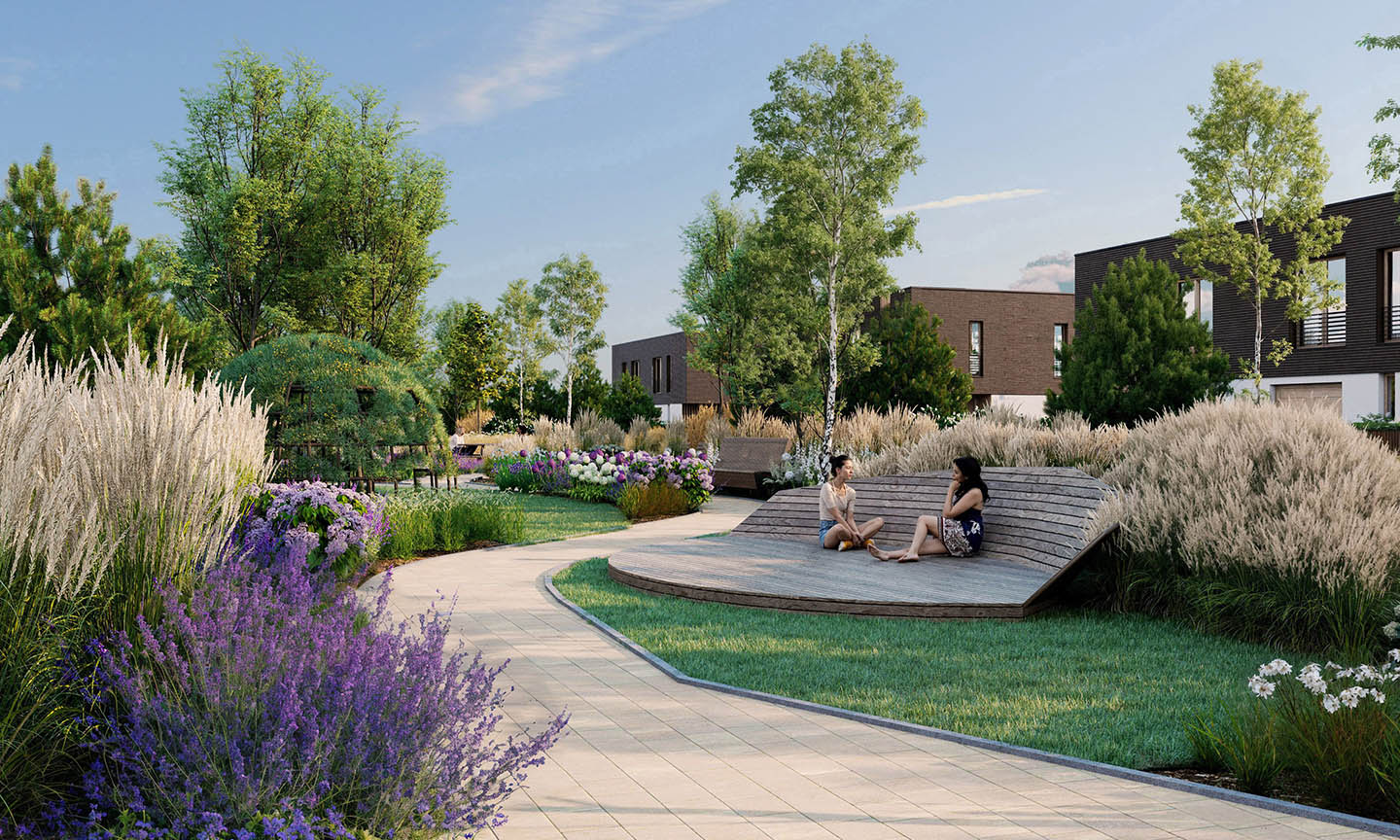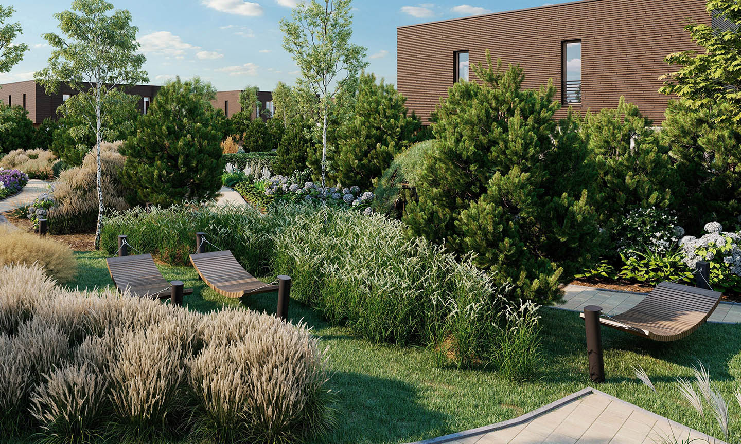 Ponad 4000 m² zieleni zaprojektowanej z wyczuciem równowagi – między tym, co naturalne, a tym, co wygodne. Ścieżki, które prowadzą bez pośpiechu. Zieleń, która nie dzieli, lecz łączy. Leżaki, hamaki i ławki ukryte wśród roślinności – stworzone po to, by zatrzymać się na dłużej. Rozgościć się. Odetchnąć naprawdę.